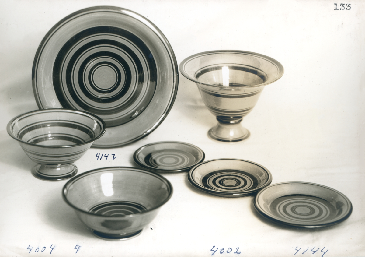 Skålar, fat och assietter från Bo Fajans, formgivare Eva Jancke-Björk, tidigt 1900-tal.