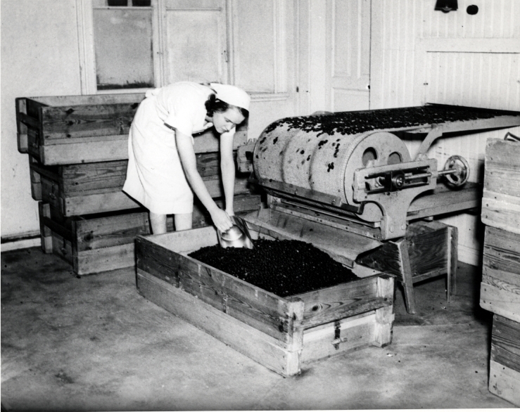 Titel: Mottagningen i slutet av ångbandet där nuvarande laboratorium är beläget (år 1978). Fotot från 1938 Rut.