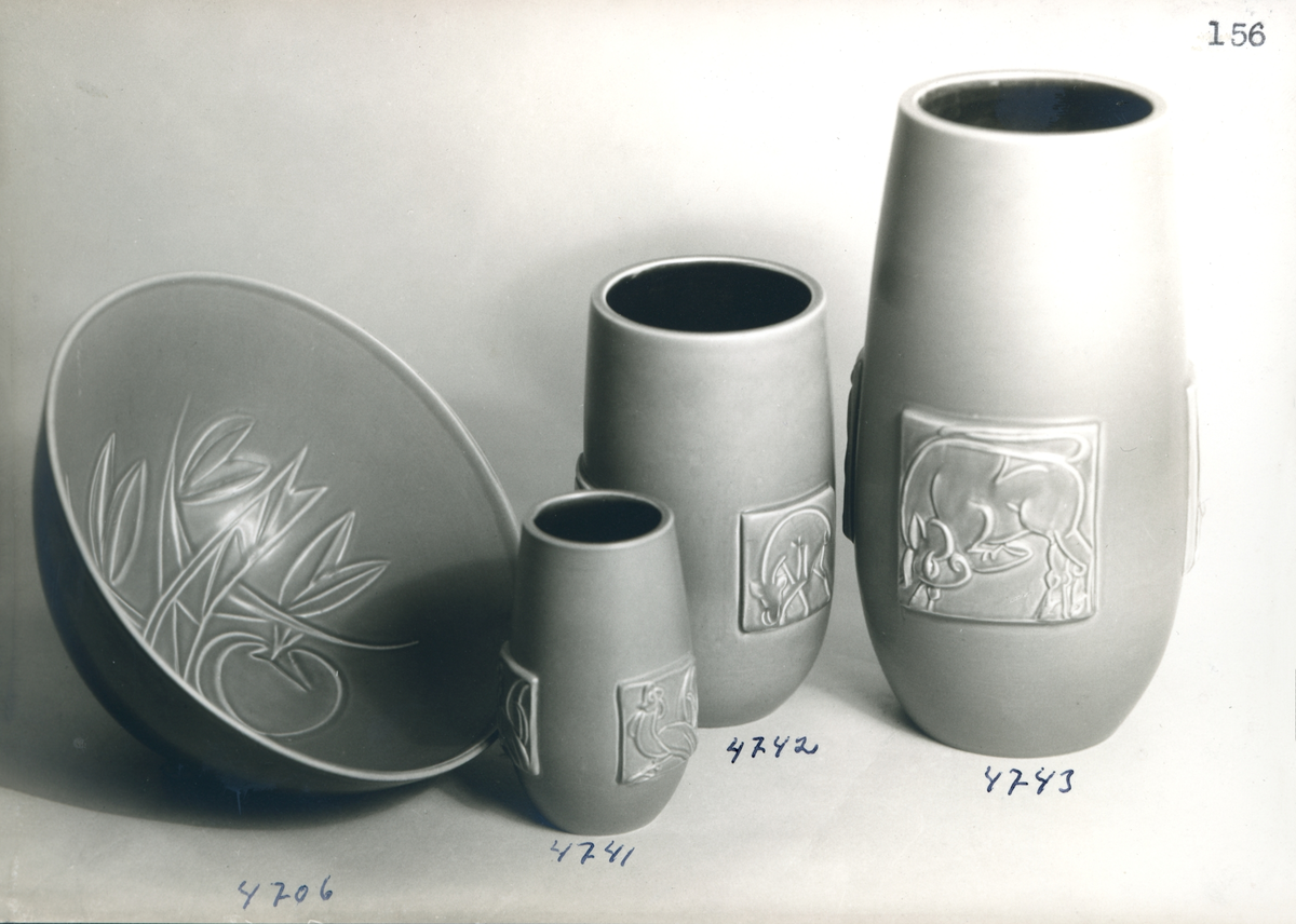 Skål och vaser från Bo Fajans, formgivare Maggie Wibom, tidigt 1900-tal.