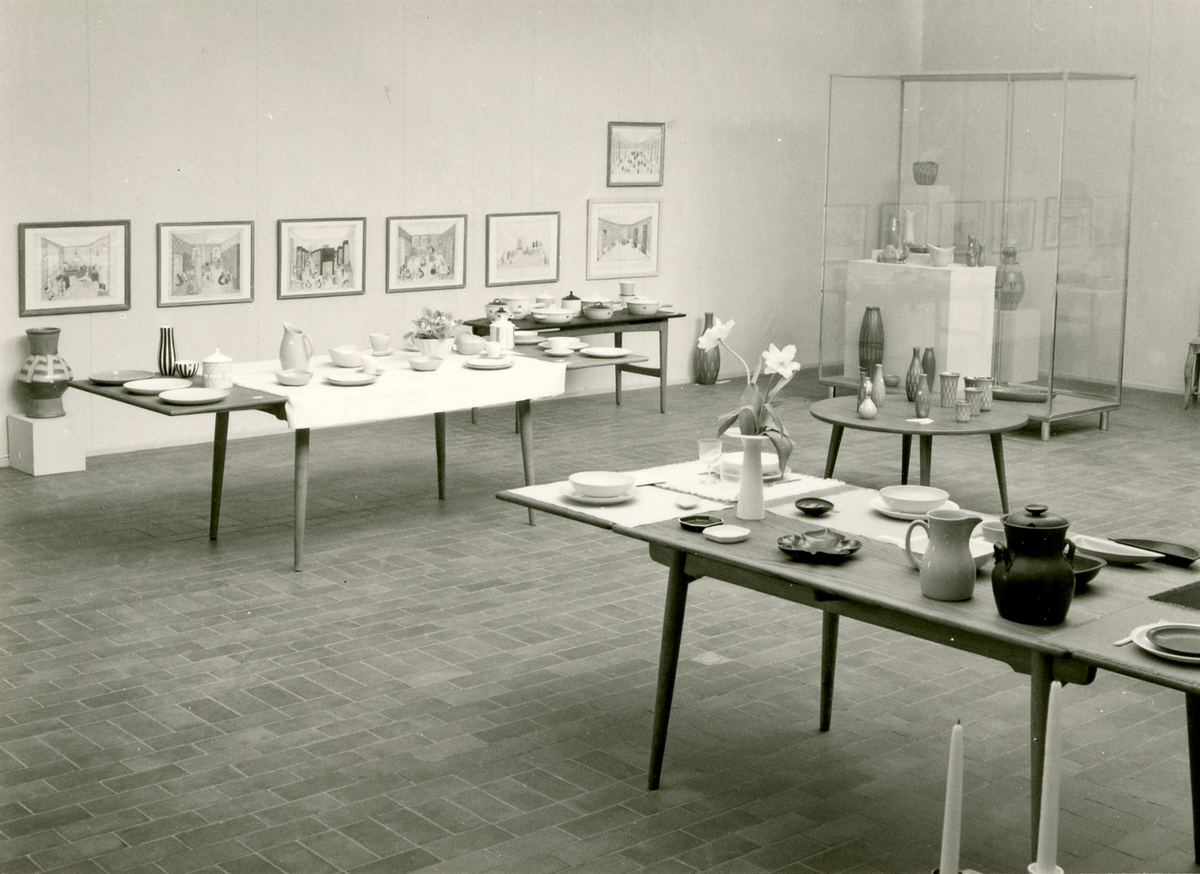 Utställningshallen med keramik från Bo Fajans, Gefle Museum 24/4 - 4/5 1956. På väggen hänger tavlor av Josabeth Sjöberg.