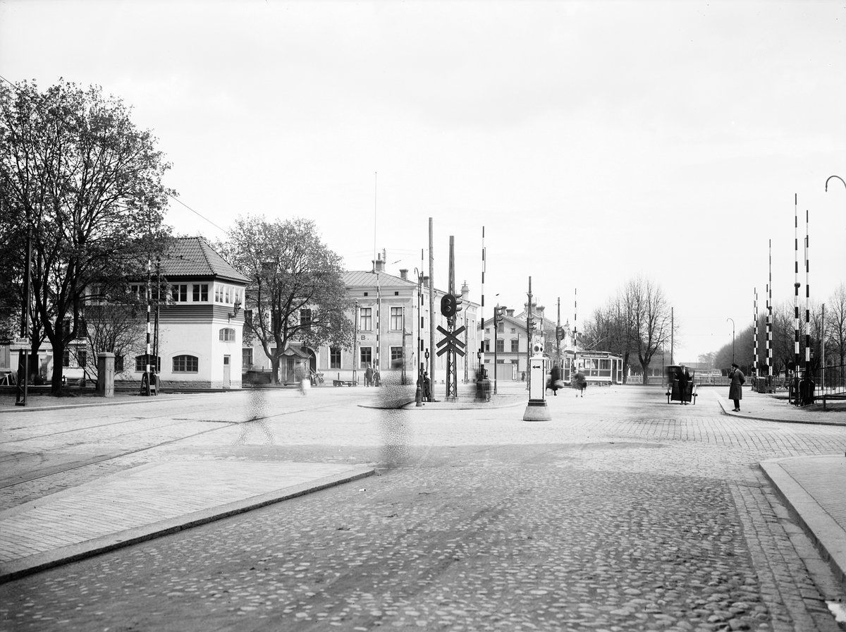 Järnvägsövergången vid korsningen Nygatan - Lilla Esplanadgatan österut. Bellanders till vänster, Lillån skymtar i bakgrunden. Ställverk för växel och signalsäkerhet