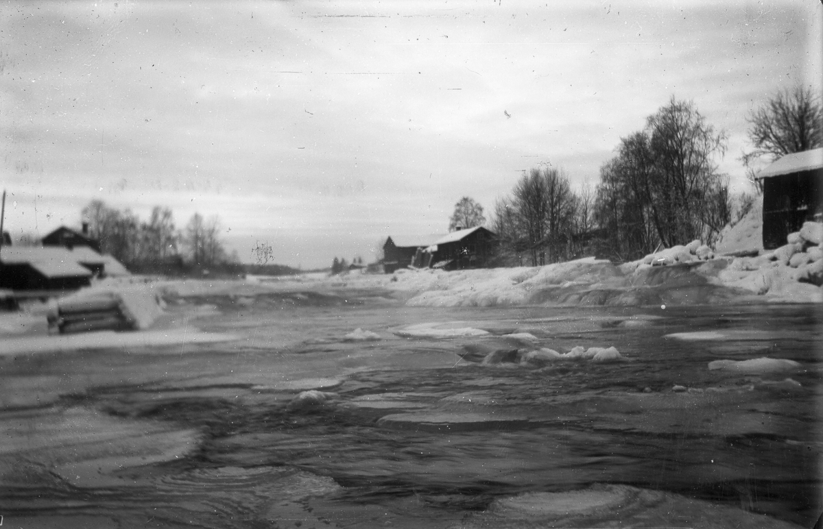Lenningeforsen i Voxnan. Till vänster "Sandbergs smedjan".