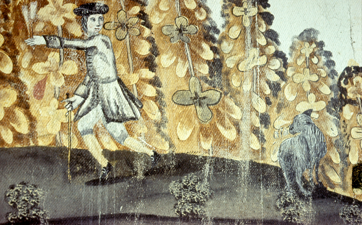 Del av väggmålning. En man, herde, med en get framför bleknande löv.