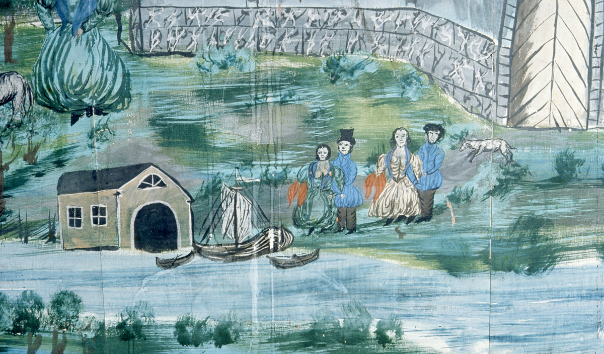 Del av väggmålning "Haga slott". Par på väg ned till vattnet. Båtar och båthus.