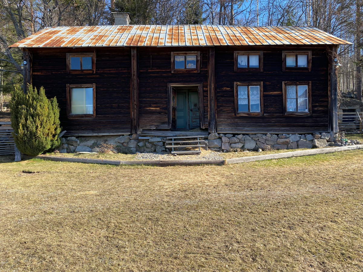 Bostadshus uppfört i timmer, takbeläggning av pannplåt. Solblekta fasader.