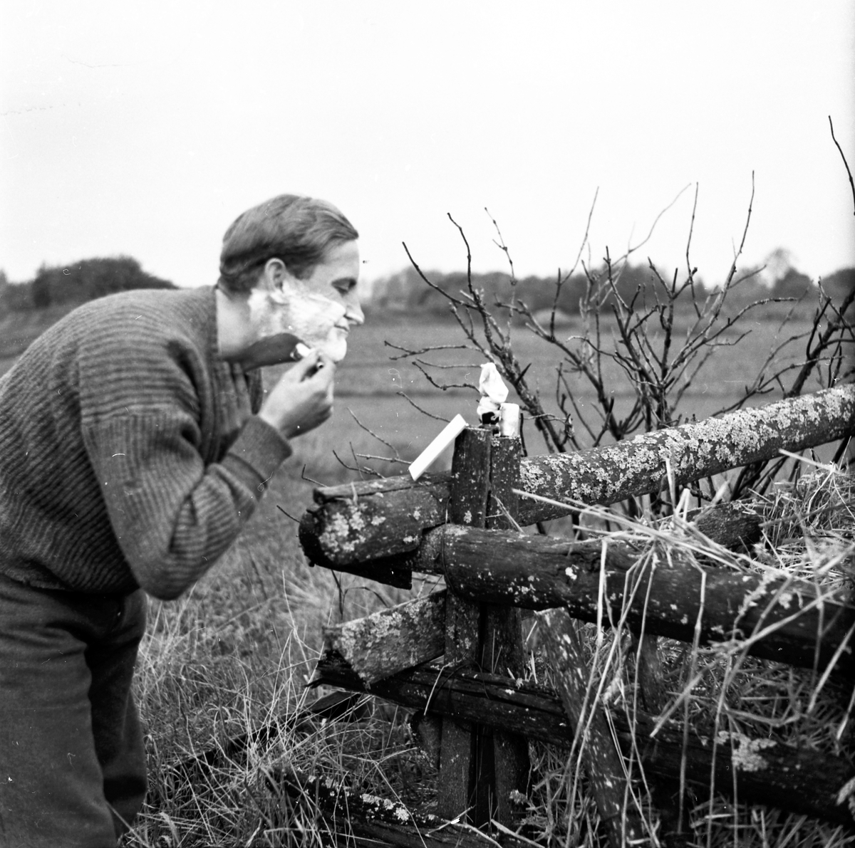 En soldat från Hälsinge Regemente, I 14, rakar sig under en fältövning