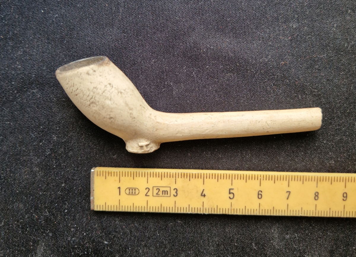 Kritpipan F299, med initialen H på klackens ena sida. Trolig datering mellan år 1690 och 1720. Från arkeologisk undersökning i form av schaktningsövervakning i Kvarteret Springer, Gävle stad och kommun. Inom Gävle stadslager, L1951:5633.