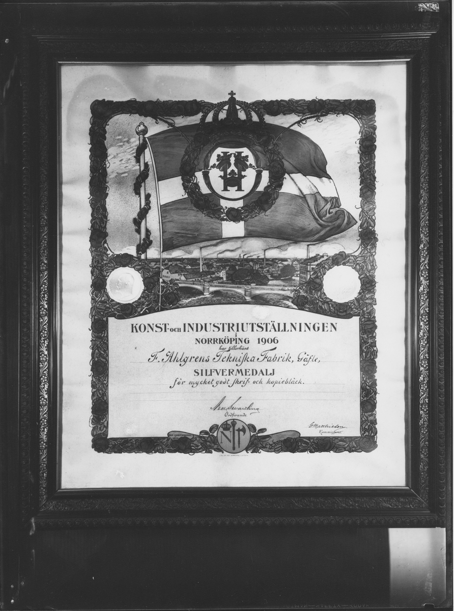 Fotografi av diplom: Konst- och industriutställningen i Norrköping 1906. " Silfermedalj för mycket godt skrif och kopiebläck".
