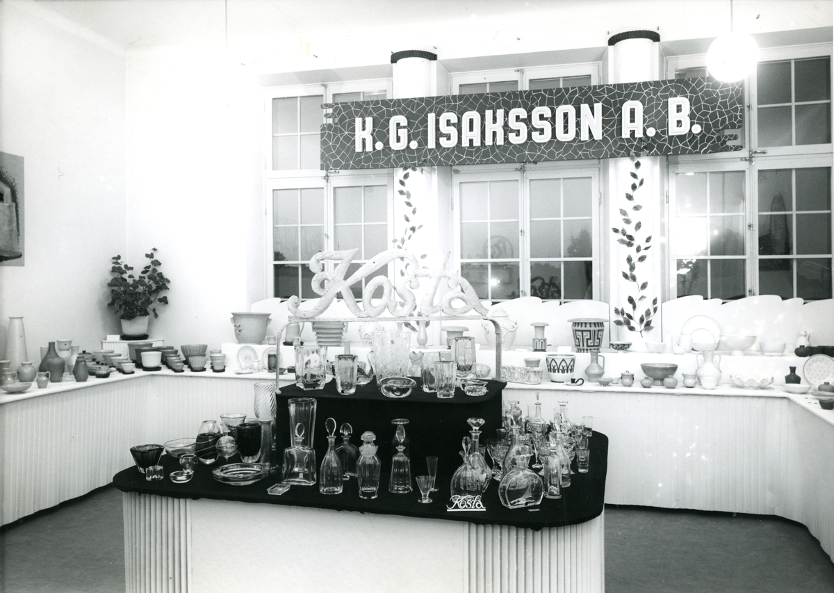 Utställning av glas från Kosta Boda och keramik från K. G. Isaksson A. B. Längst till vänster syns en del keramik från Bo Fajans.