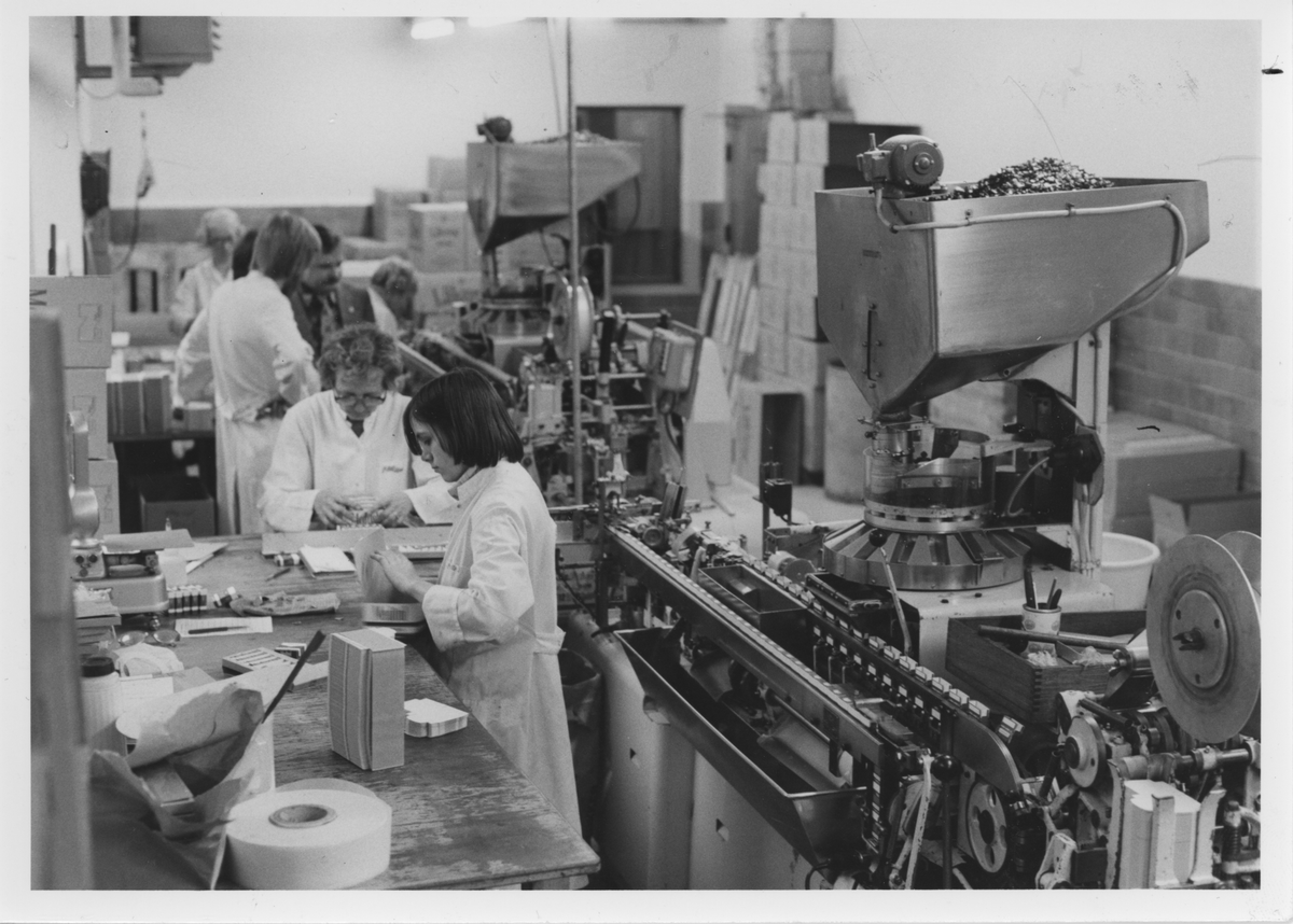 Askpackningen i Danmark november 1977. Arencomaskin packar Läkeroltabletter. Flera kvinnor handpackar och sköter maskinen.
