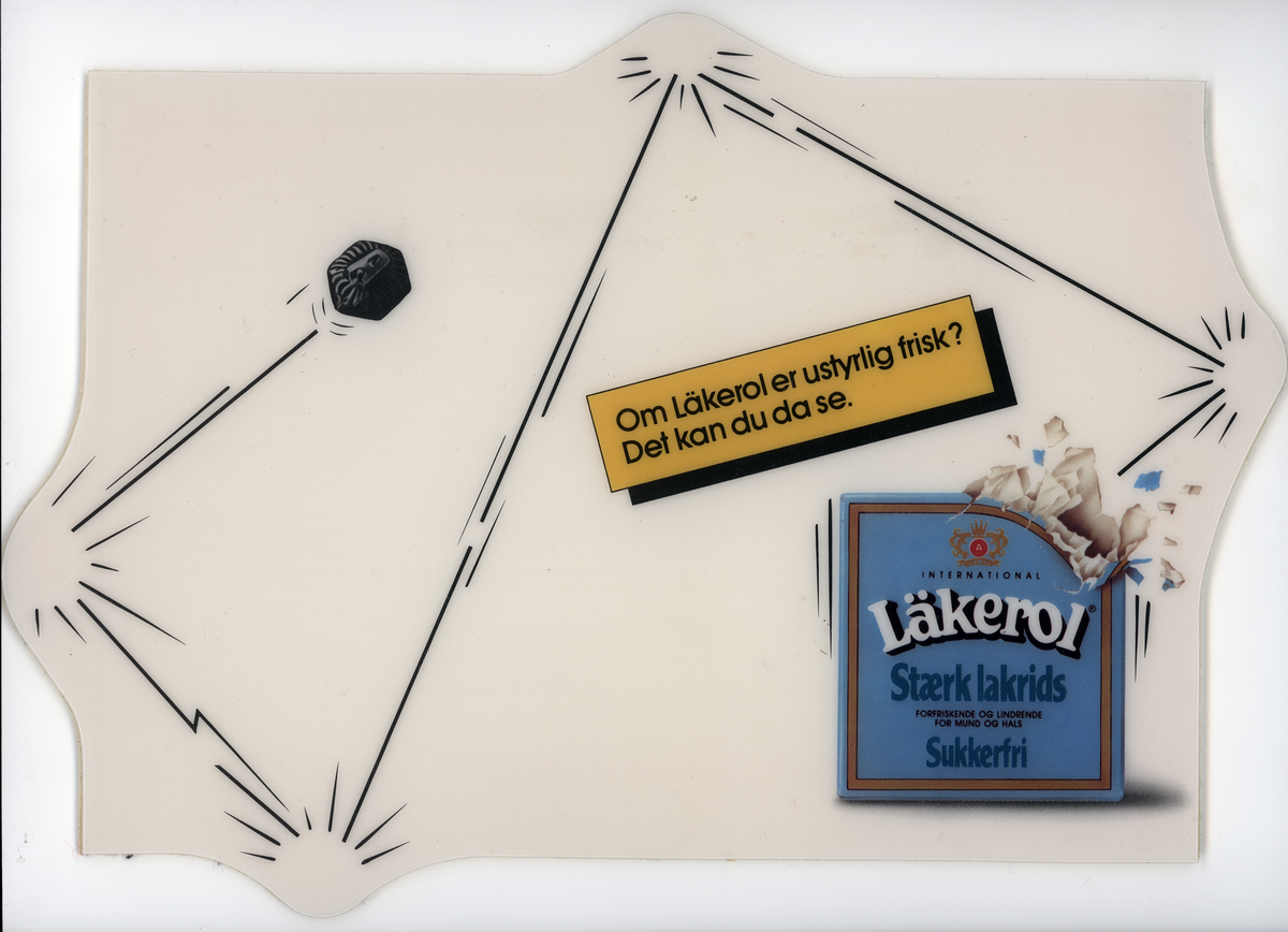 Reklambild för ny Läkerol, dansk marknad. Blå ask i nedre högra hörnet. Övre högra hörnet på asken "sprängs" inifrån. En Läkeroltablett far ut och studsar runt i bild.