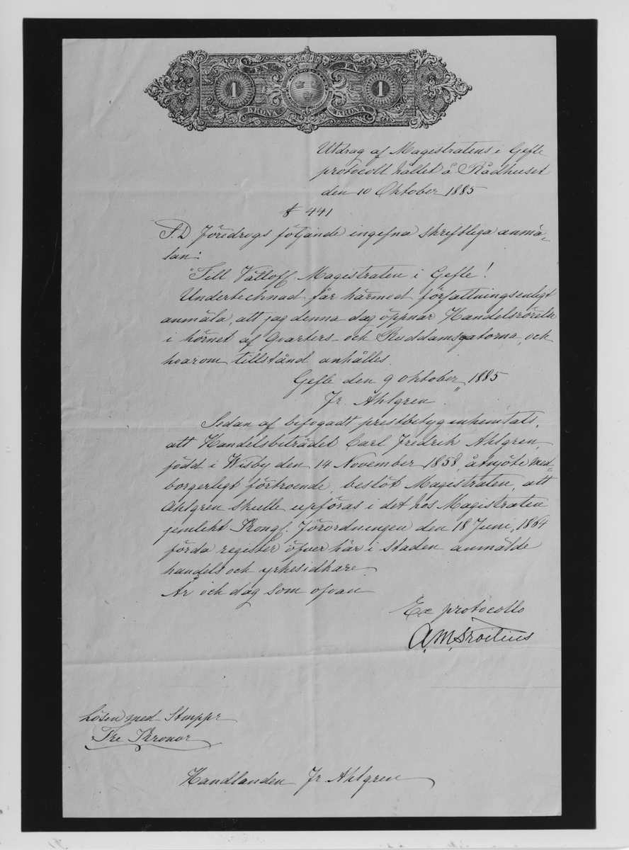 Magistratbevis från 10 oktober1885 där Fredrik Ahlgren uppfördes i registret över "i staden anmälde handels och yrkesidkare."