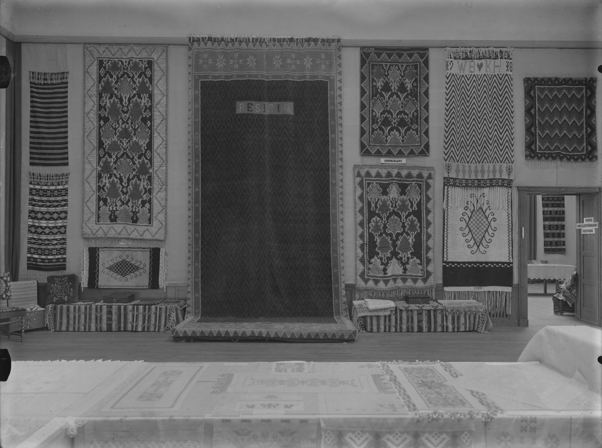 Utställning av hemslöjdstextilier, täcken, mattor, ryor mm.