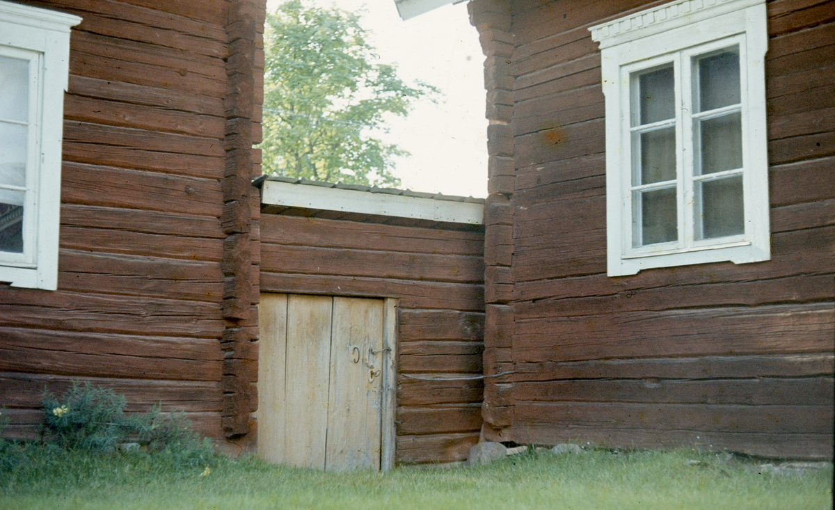 Titel: Del av gårdsanläggning. Rödmålade timmerbyggnader.