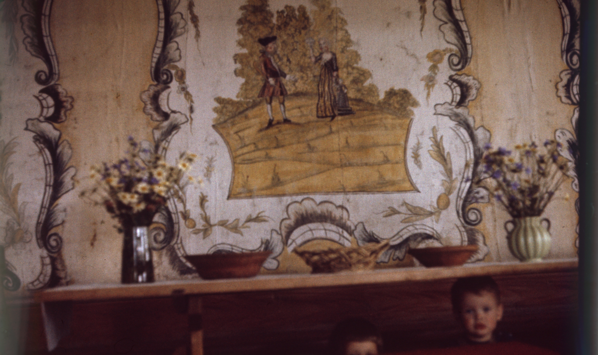 Väggdekor, del av. "Vår tiden". Ett dansande par framför blommande störar och mark som gror i förgrunden.