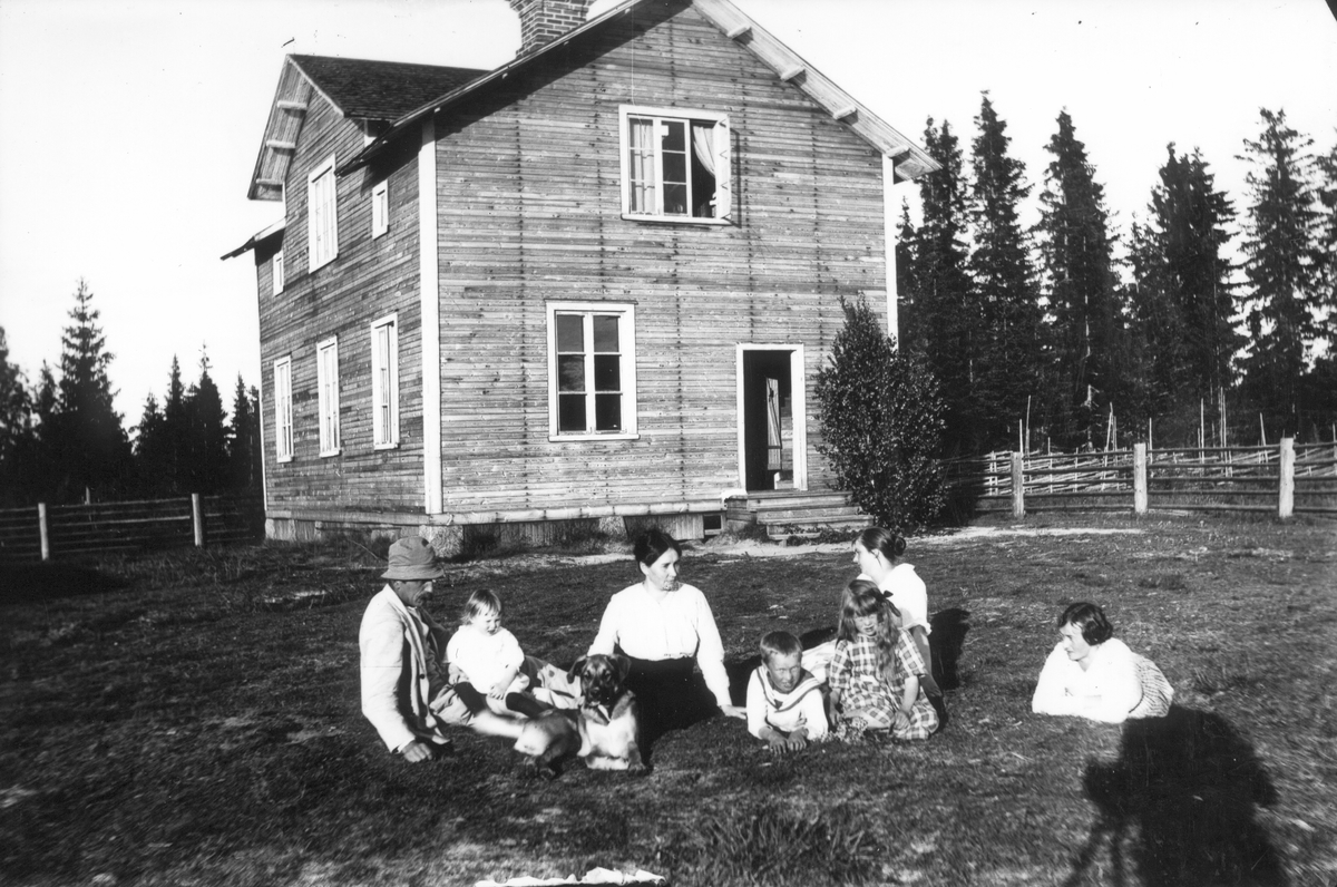 Fjärdingsman David Svensson med hustrun Emmy och barnen Lisen, Tord och Britt, bakom henne okänd dam. Till höger Elin Nilsson från Lenninge 6:44.