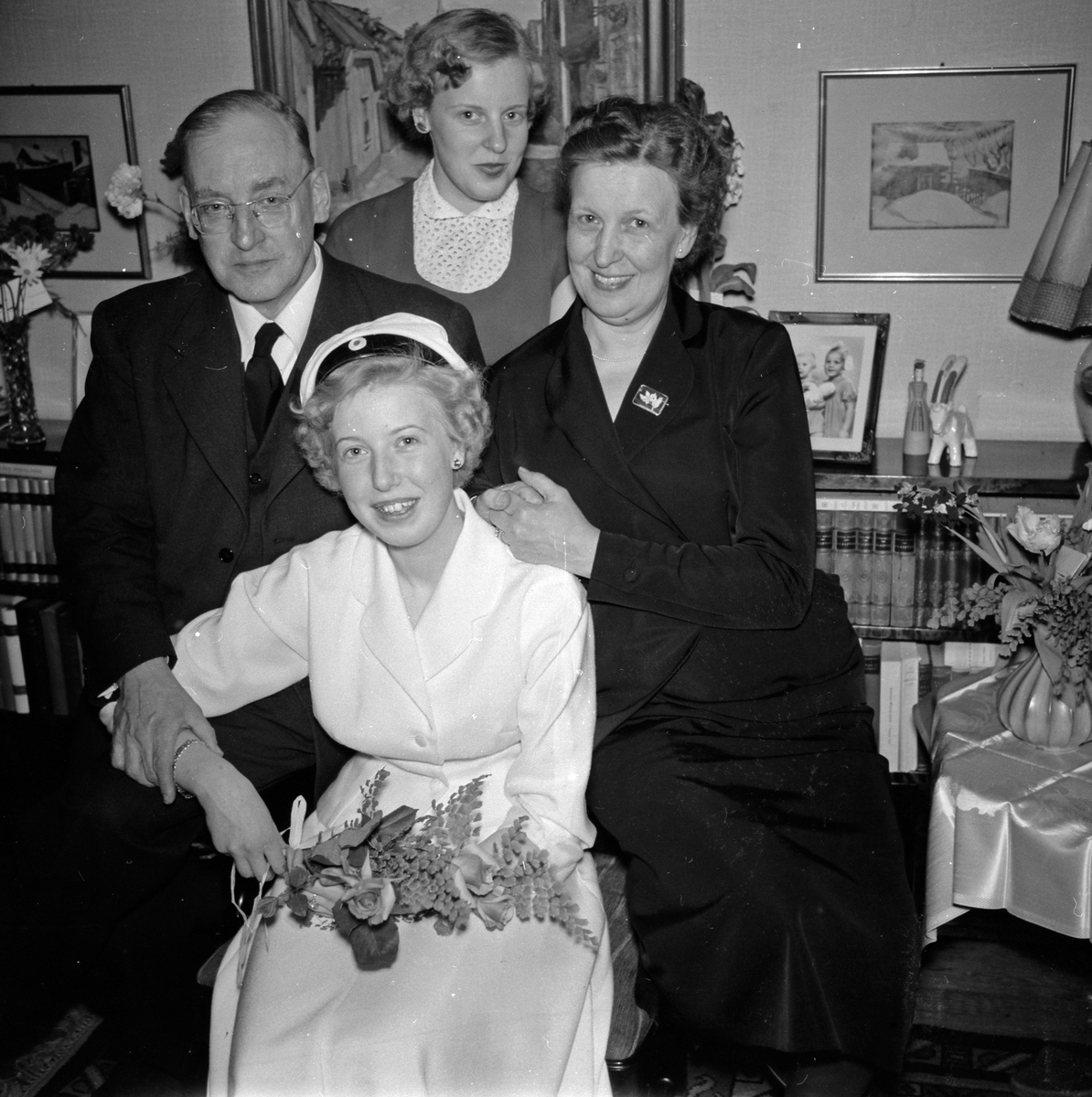Kvinnlig student i hemmet poserar med sina föräldrar och syster