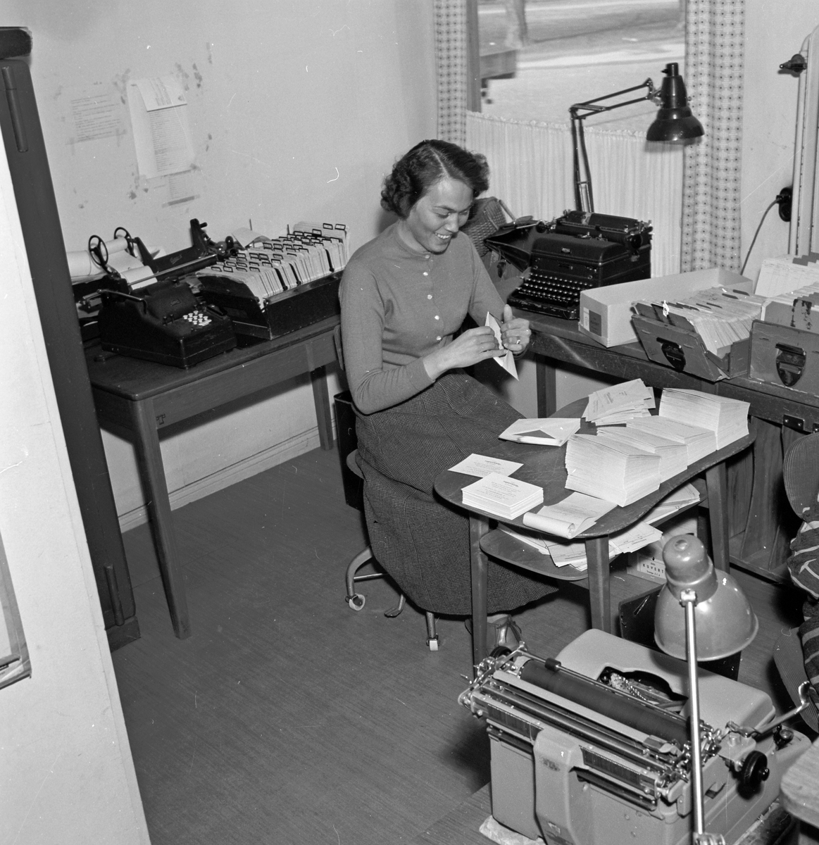 Möbelproduktion AB, en kontorsarbetare på försäljningskontoret lägger kort i kuvert