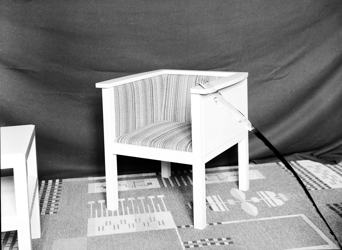Stol tillverkat av Larsson & Co. AB, Brynäs. Firman grundades 1872 som skopliggfabrik i Valbo. År 1877 flyttades verksamheten till Brynäs. Blev aktiebolag 1908.