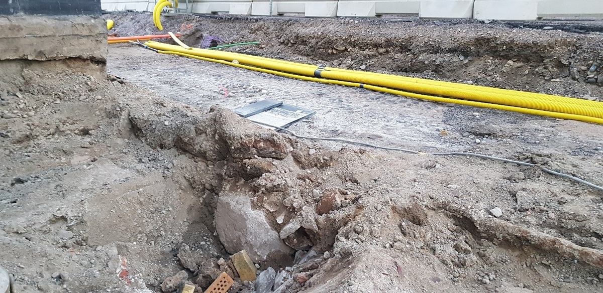 Övre delen av ett djupschakt med grundsten i kanten och kullerstensläggning intill. Från arkeologisk undersökning i form schaktningsövervakning vid Stadsbiblioteket, Gävle stad och kommun. L1951:5633.