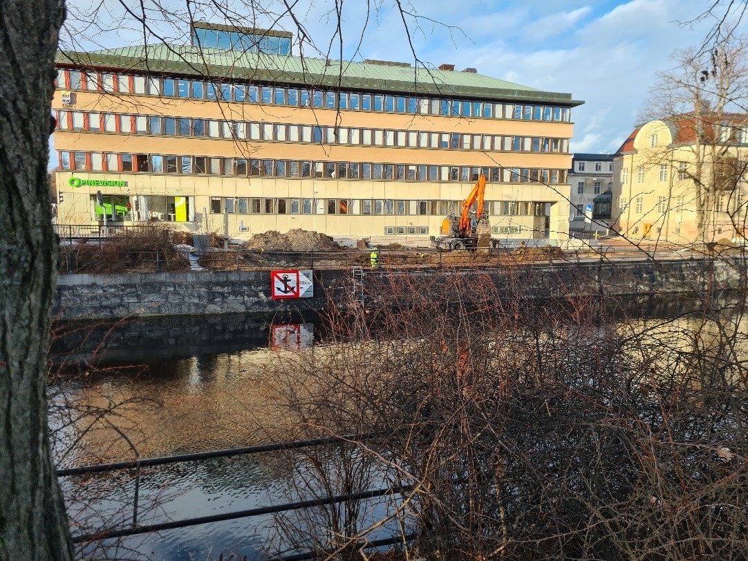 Foto mot det undersökta schaktet med Förvaltningshuset i bakggrunden. Foto mot norr. Från arkeologisk undersökning i form schaktningsövervakning längs Norra Strandgatan, Gävle stad och kommun. L1951:5633.