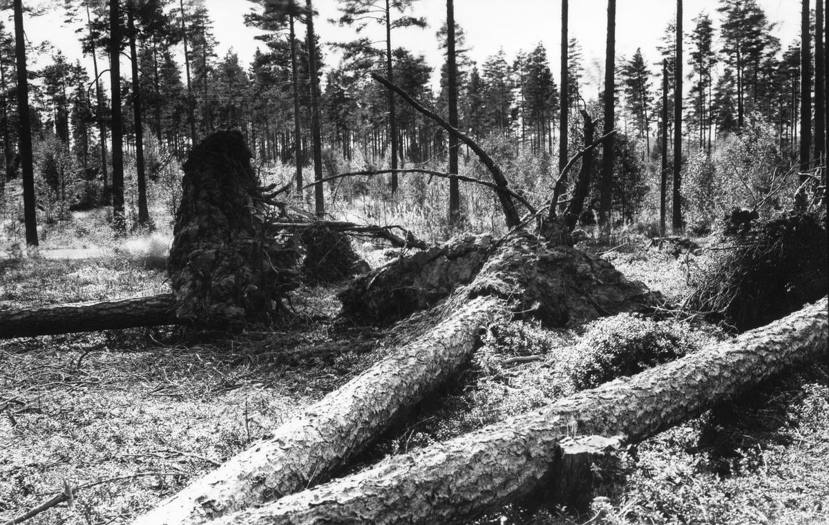 Skog i närheten av Storvik. Stormfällda tallar efter höststormen år 1937.