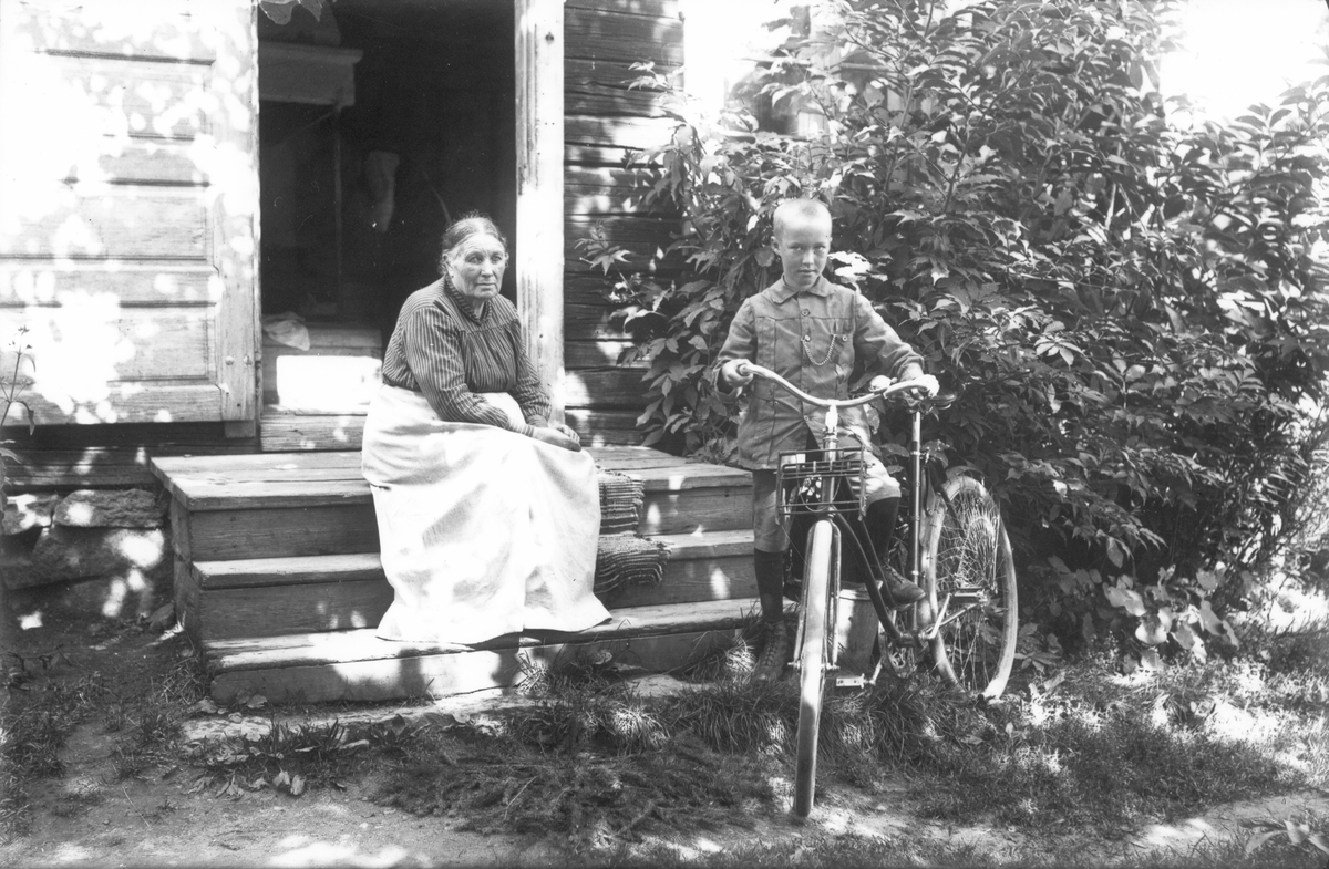 På trappan till "Målars" bryggstuga, Helena Nilsson, född 1853 (Lenninge 6:44). Pojken är Nils-Nils-Nils = Nils Johansson, född 1901 (Lenninge 1:3).