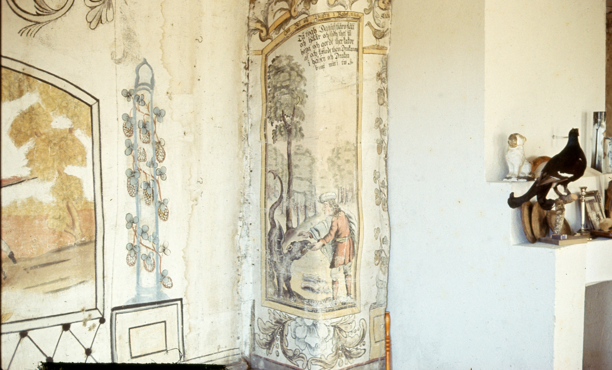 Väggmålning med bibliskt motiv och text. Föreställande Daniel som dräper draken i babylon.
