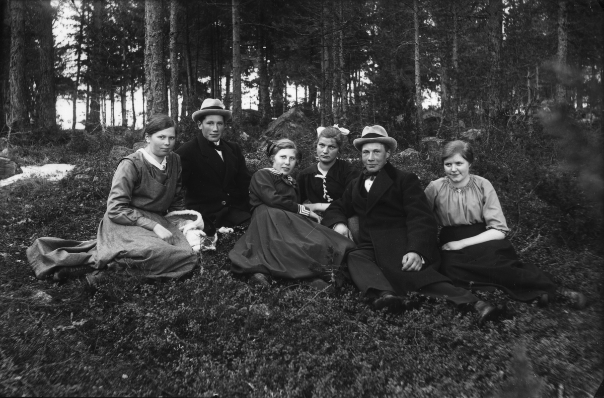 Från vänster: trädgårdsmästare Erikssons dotter Lisa, född 1902 från Lenninge 6:42, Elis Olsson från Kattnäs, född 1898, Lenninge 4:47, Adela (efternamnet okänt, troligen piga på herrgården), skogvaktare Johanssons dotter Vendla, född 1898 från Lenninge 5:31, Karl Olsson från Kattnäs, född 1900, Lenninge 4:47 och Karin Larsson från Smehammars, född 1901, Lenninge 6:32. Foto den 1 april 1918.