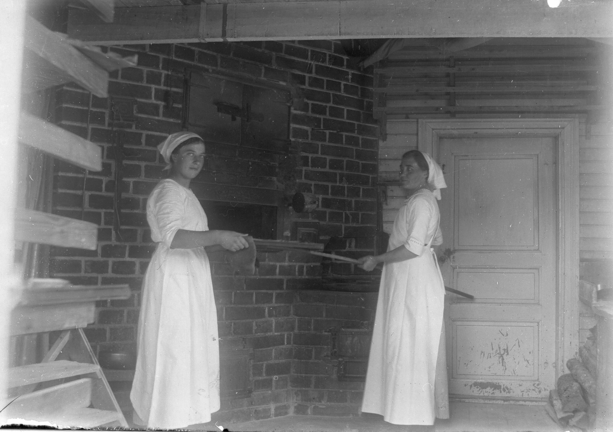 Två okända kvinnor vid bakugn.
