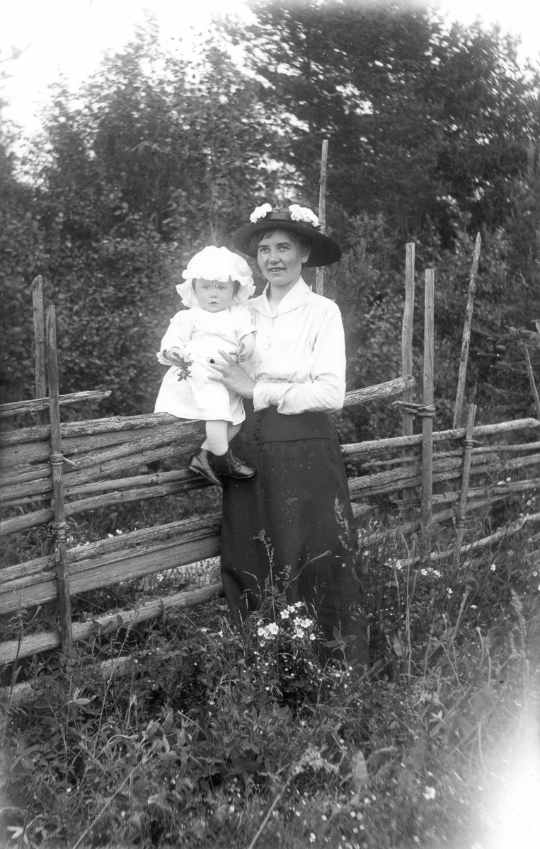 Okänd mor med barn vid gärdesgård.