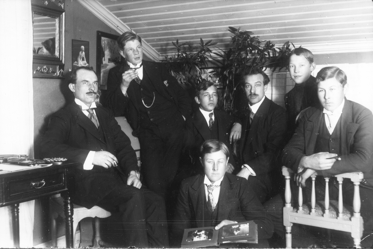 Från vänster: Målar-Emil (Nilsson), Nils Nilsson från Näset, Voxsätter 14:1, född 1895, Stor-Pelles Johan Eriksson, Voxsätter 10:1, född 1901, i mitten nedtill Herman Eriksson, Lenninge 5:11, född 1898, Målar-Erhard, okänd samt Erik J Eriksson från Lenninge 5:11, född 1896.