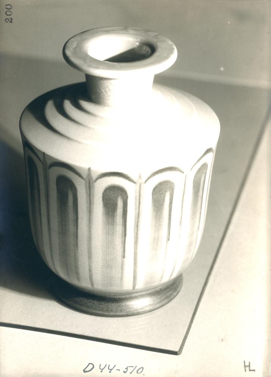 Vas från Bo Fajans, formgivare Ewald Dahlskog, tidigt 1900-tal. Gråvit krakeleradglasyr med svart dekor. Fotografiet är märkt med fotografens signatur i blyerts.