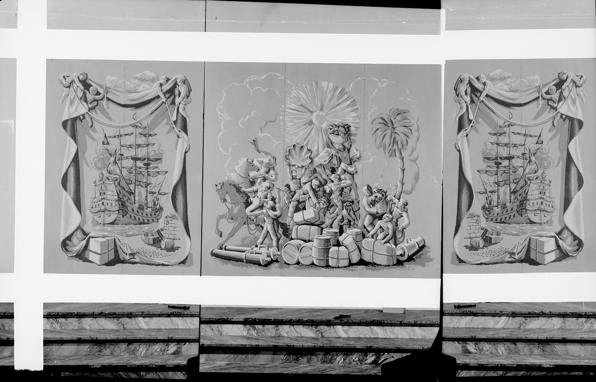 Fotografiet är ett montage av tre negativ. Två är bilder av skepp och det i mitten är en bild av sjöröveri