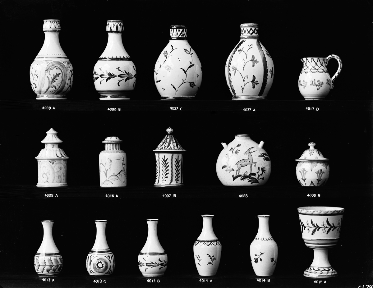 Bo Fajans. Bobergs Fajansfabrik AB. Numrerade föremål:4006 B, 4007 B, 4008 A, 4009 A-B, 4013 A-B-C, 4014 A-B, 4015 A4017 D, 4028, 4037 A-C, 4046 A.