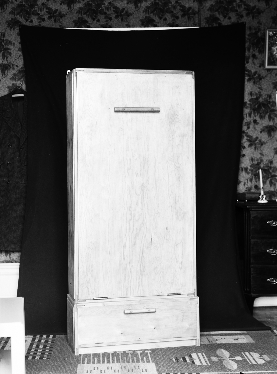 Sängskåp tillverkat av Larsson & Co. AB, Brynäs. Firman grundades 1872 som skopliggfabrik i Valbo. År 1877 flyttades verksamheten till Brynäs. Blev aktiebolag 1908.