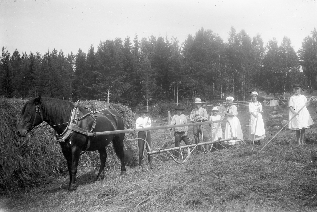 Slåtteriarbete hos Hisveds, Långhed. Algot Hisved kör häst och räfsa.