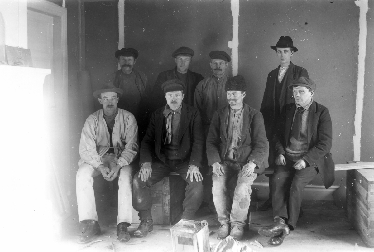 Sittande från vänster: Målar-Erhard Nilsson, byggmästare Borg från Hanebo, okänd, elektriker Linder från Sibo i Hanebo, stående längst till vänster Per Larsson från Lenninge.
