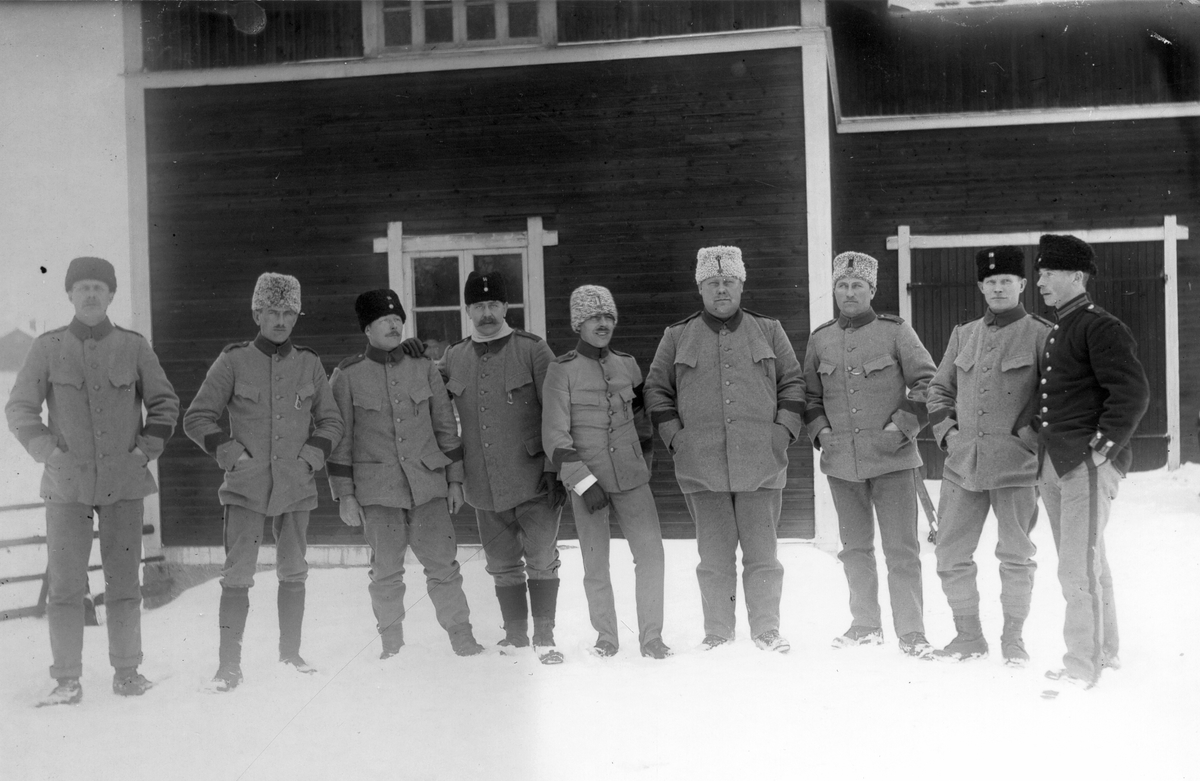 Framför ekonomibyggnaden i Skinnars, där soldaterna bodde en tid. Femte mannen från vänster är Pelle Styf från Per-Olsens i Lenninge.