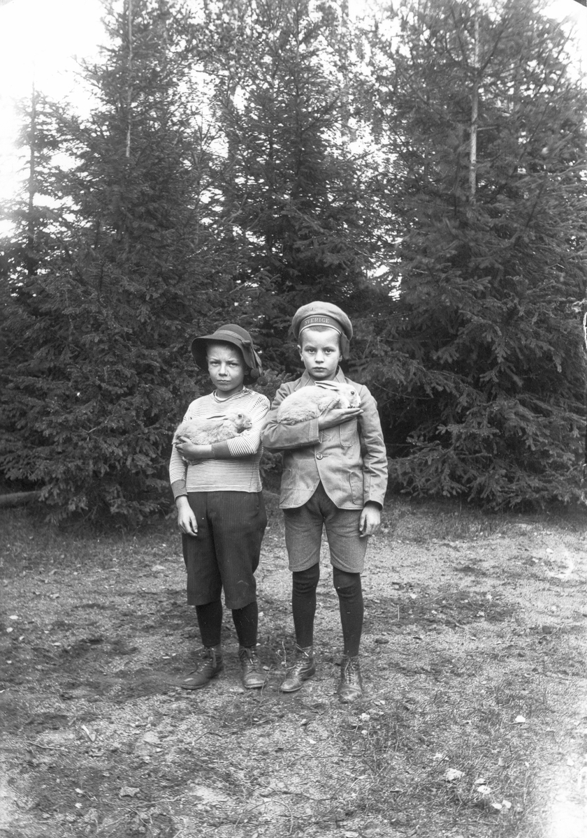 Två barn med kaniner i famnen. Pojken till höger är förmodligen en av fru Bellanders söner. Foto i september 1918.