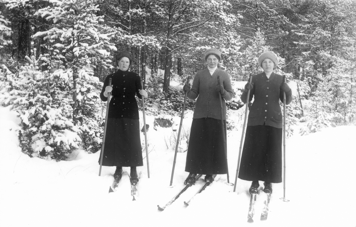 Tre kvinnor på skidtur, i mitten Brita Persson, född 1894, Lenninge 6:14.