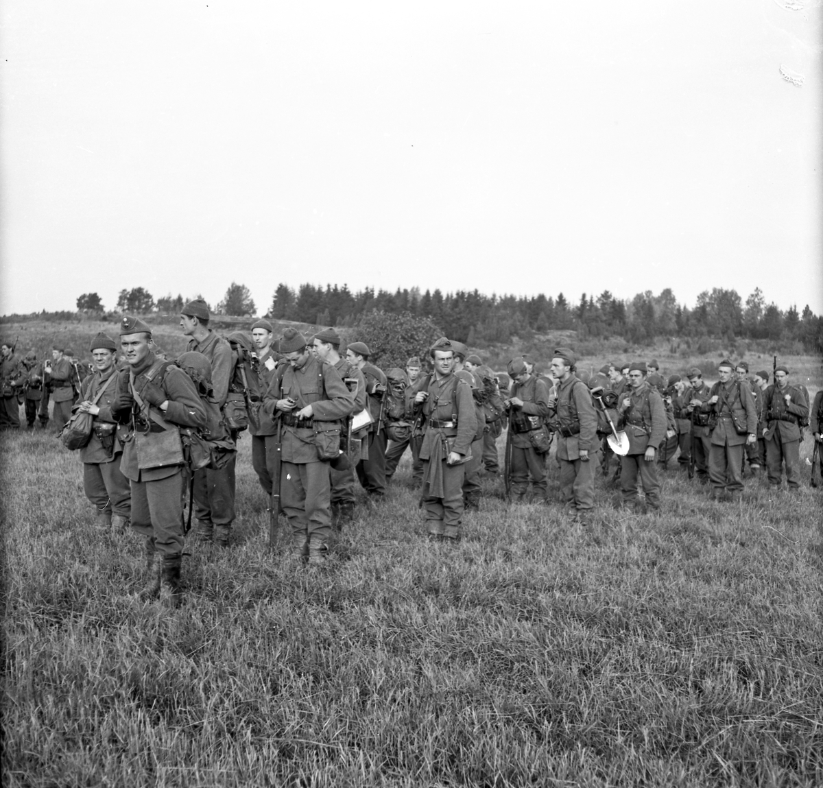 En grupp soldater från Hälsinge Regemente, I 14, ute på manöver. I framkant till vänster i bild står en fänrik med en kartväska.