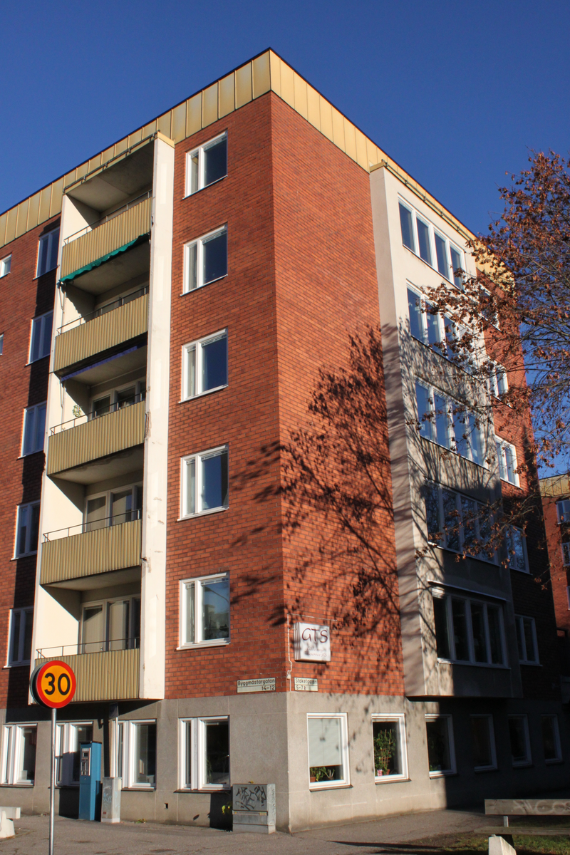 Brf Adelsklubben sedd från väster och Staketgatan.