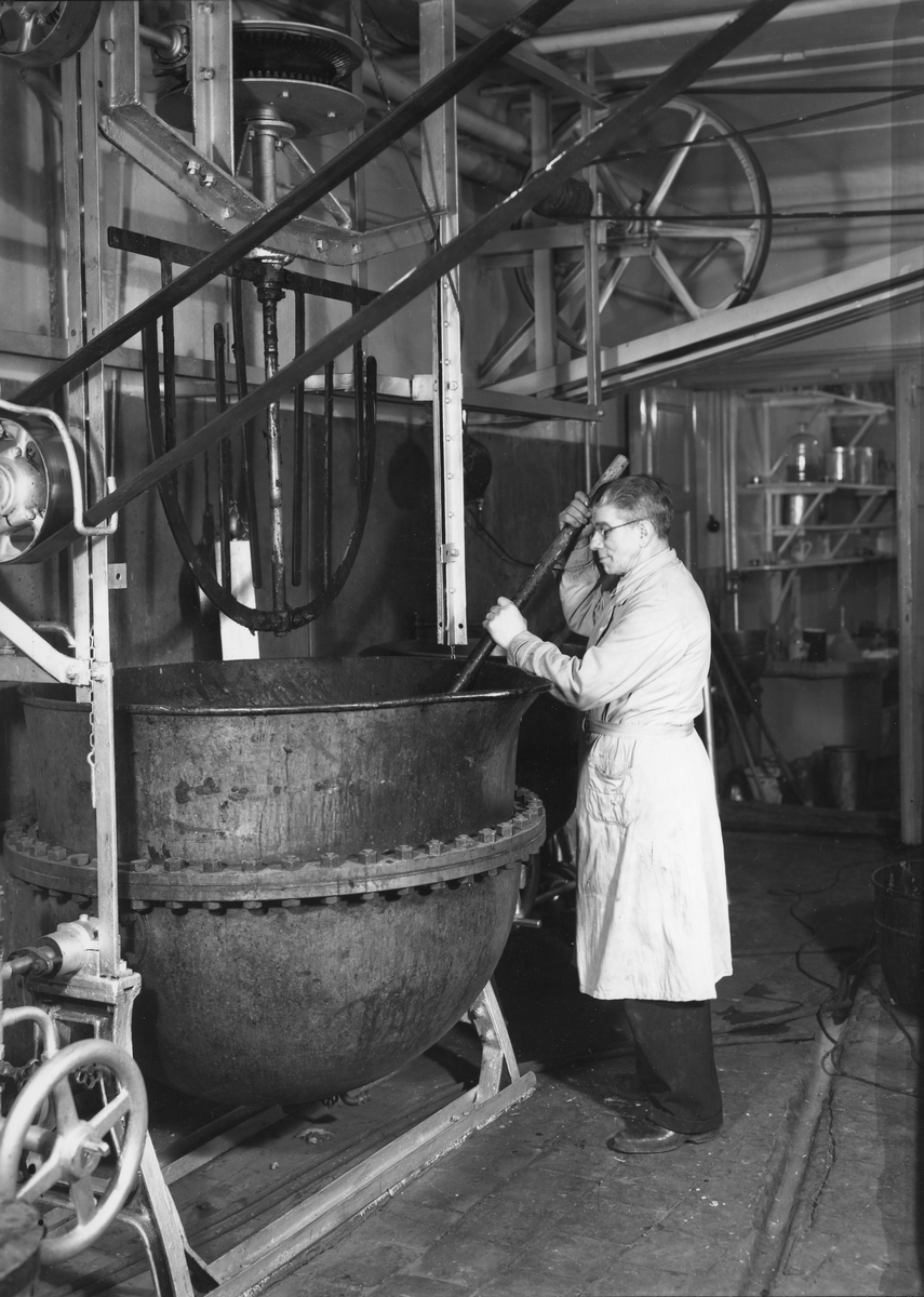 Kokning av skokräm vid tekniska avdelningen på Skeppargatan. Birger Andrén, verkmästare.