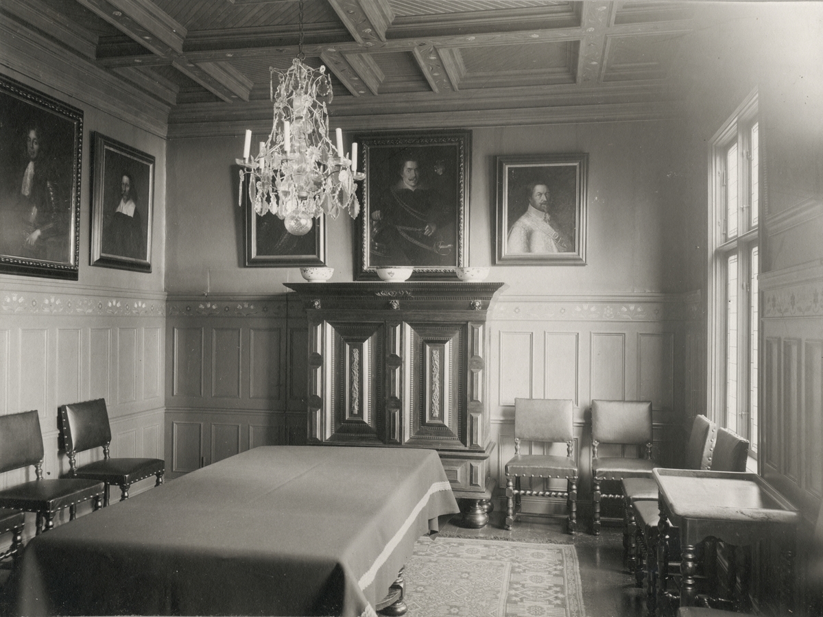 Interiör från Villa Rettig, dekorerade väggpaneler och porträtt på väggen. Fönster med blyspröjs.