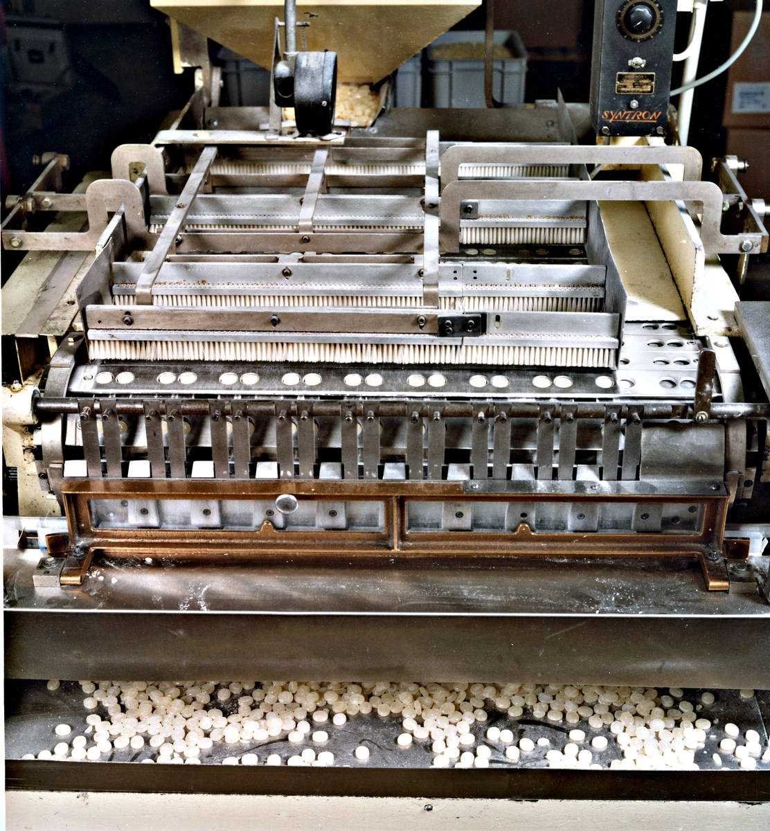Packningsavdelningen, Medicold på Ahlgrens Tekniska fabrik i Gävle. Tabletterna putsas pudret försvinner.