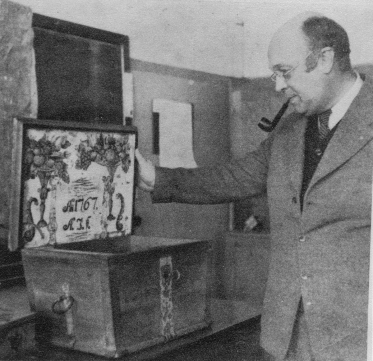 Här ses Philibert Humbla under utställningen "Helgdalskväll i Ljusdal" Kistan är från Hans-Ers-gården.