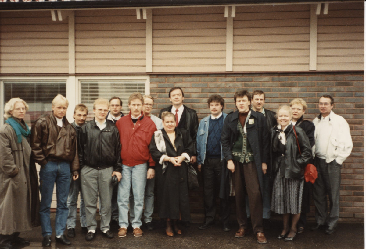 Män och kvinnor uppställda för fotografering utanför Infocenter vid Ahlgens tekniska fabrik AB i Gävle.