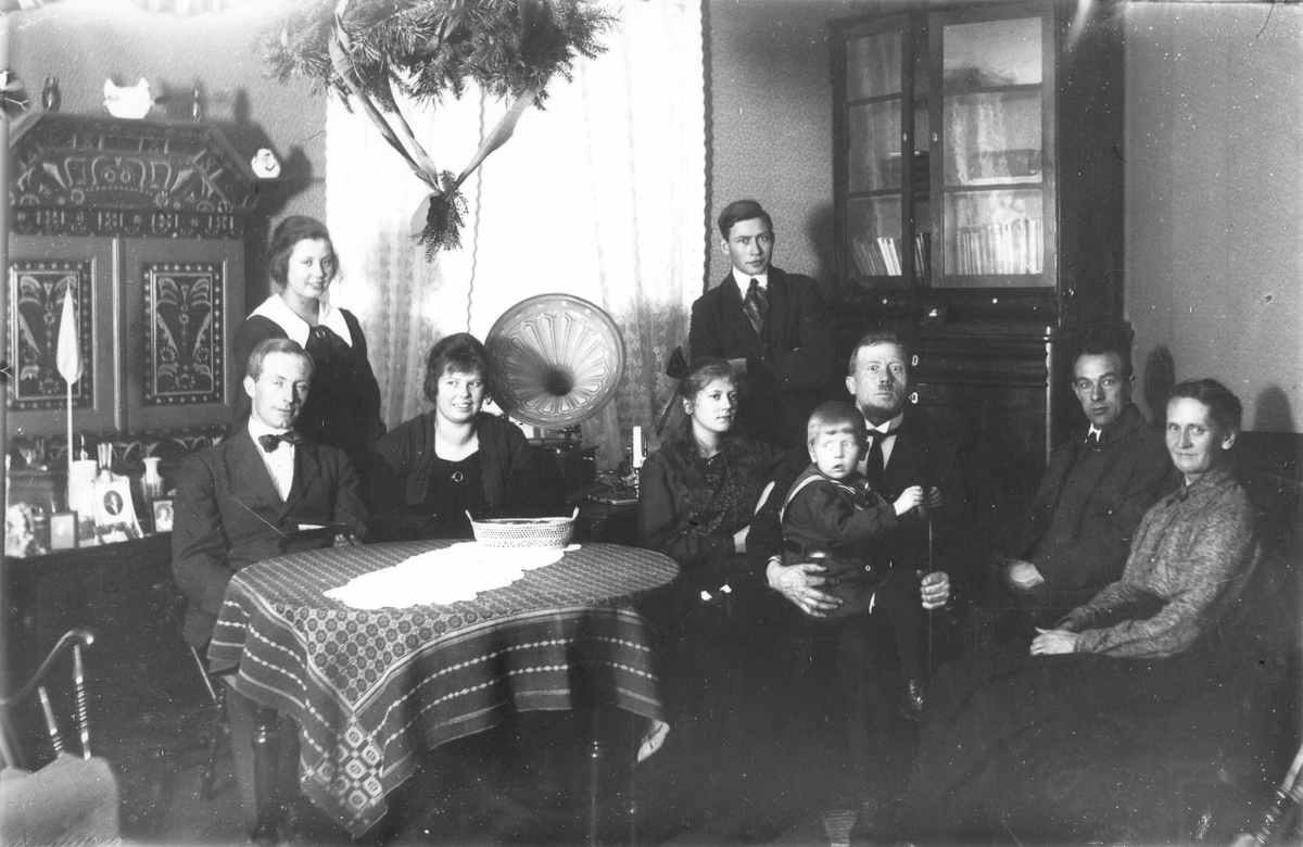 Sittande från vänster: Herman Larsson, Lisa Eriksson, Emmy Eriksson, N E Eriksson med sonen Sven, Erhard Nilsson och Emma Eriksson.
