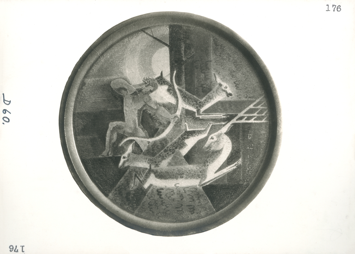 Bordsskiva "Jägare med hjortar" från Bo Fajans, formgivare Ewald Dahlskog, tidigt 1900-tal.